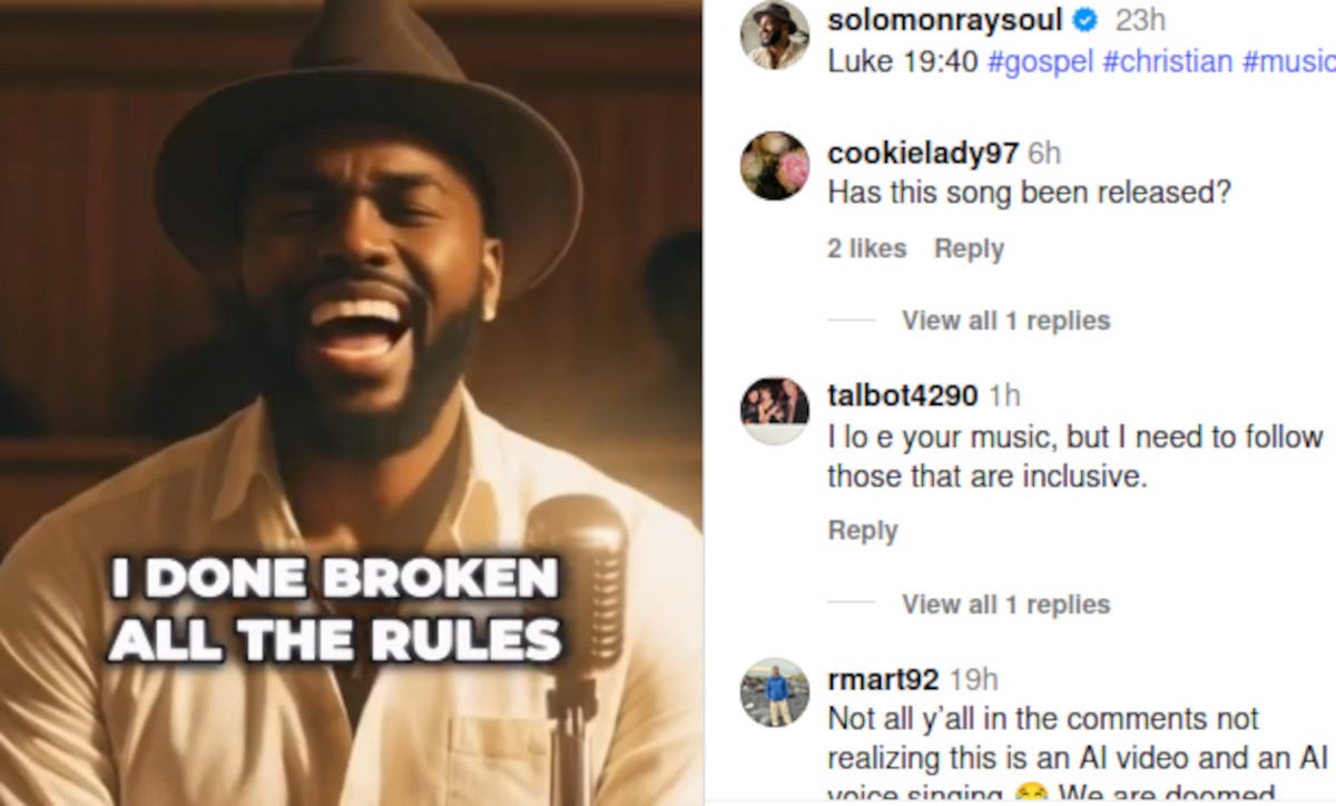 But a fan of the song, John LaCarter, wrote on X: “As much as I hate to say it, this song is really great. ... Hey if God can make a donkey talk1, He can also use AI.”