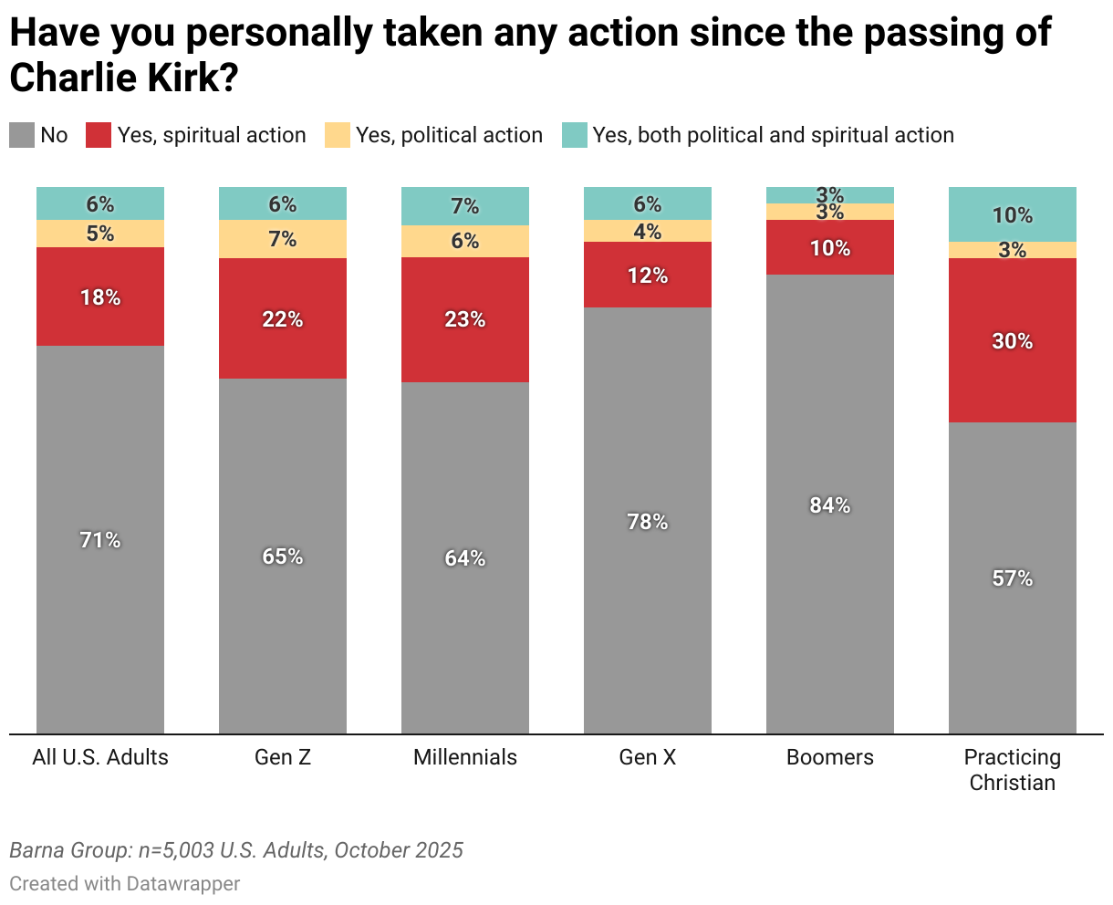 According to a survey released last week by the Barna Group, a nonpartisan, for-profit organization that extensively studies religious and cultural trends, about 29 percent of American adults have taken some sort of action as a result of Kirk’s death — and for 24 percent, or nearly a fourth of adults, that action has been at least in part a spiritual action.
